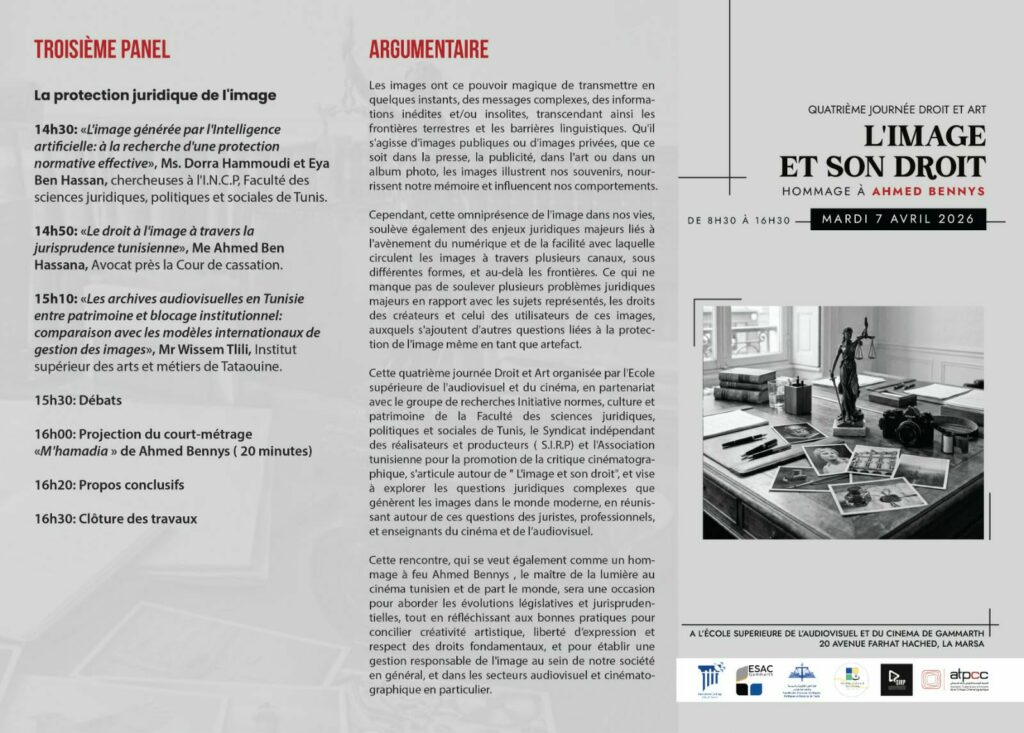 تنظّم المدرسة العليا للسمعي البَصري والسينما بقمرت، بالشراكة مع مجموعة البحث «مبادرة المعايير والثقافة والتراث» بكلية العلوم القانونية والسياسية والاجتماعية بتونس، إلى جانب النقابة المستقلة للمخرجين والمنتجين والجمعية التونسية للنهوض بالنقد السينمائي، الدورة الرابعة لليوم الدراسي «القانون والفن» تحت شعار «الصورة وحقها»، وذلك يوم الثلاثاء 7 أفريل 2026.