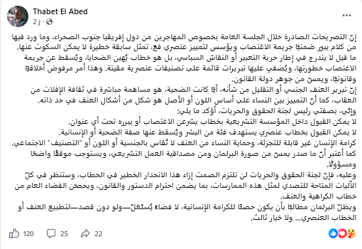 لم يظل الجدل حبيس الفضاء الإعلامي، بل وجد صداه داخل البرلمان نفسه. فقد اعتبر رئيس لجنة الحقوق والحريات بمجلس النواب، ثابت العابد، أن ما صدر “يمثل سابقة خطيرة لا يمكن السكوت عنها”، مؤكدا أن التصريحات “لا تندرج في إطار حرية التعبير أو النقاش السياسي، بل هي خطاب يُهين الضحايا ويُسقط عن جريمة الاغتصاب خطورتها ويُضفي عليها تبريرات قائمة على تصنيفات عنصرية”.