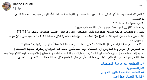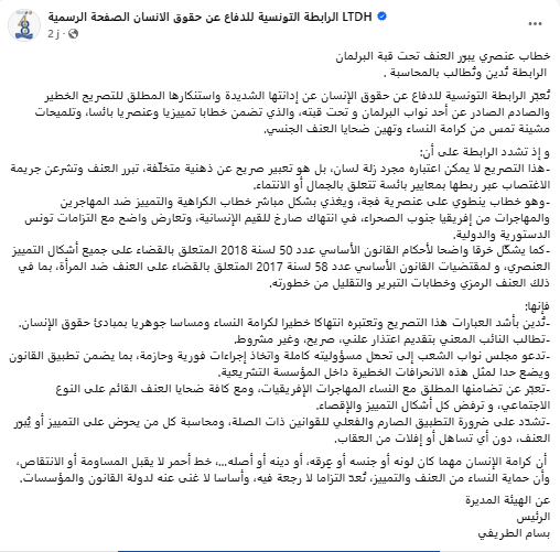 كما اعتبرت الرابطة التونسية للدفاع عن حقوق الإنسان أن ما صدر لا يمكن اعتباره زلة لسان، بل هو تعبير عن خطاب يبرر العنف ويغذي التمييز، داعية إلى محاسبة النائب المعني وتحمّل البرلمان لمسؤوليته في وضع حد لمثل هذه الانحرافات. وشددت الرابطة على أن كرامة الإنسان، بغض النظر عن أصله أو لونه، تظل خطًا أحمر لا يقبل المساومة.